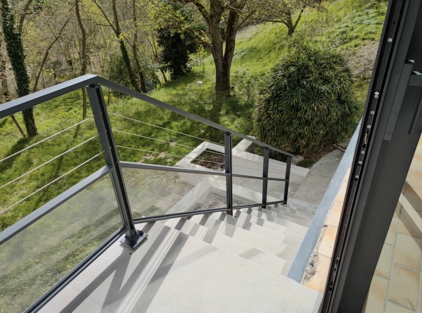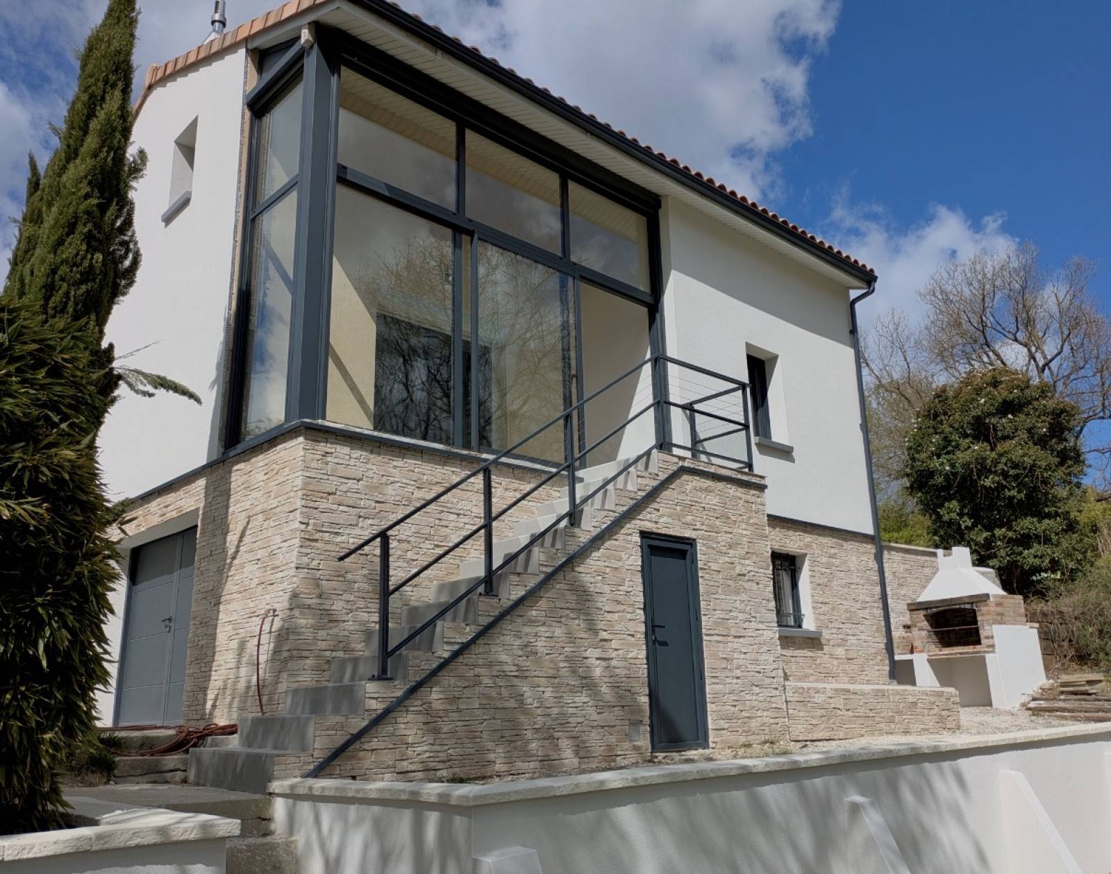 Les équipements extérieurs, comme les garde-corps, le portail et la porte de garage, participent à la fois à la sécurité et à l’esthétique générale du projet. L’ensemble des menuiseries aluminium s’intègre de manière cohérente, renforçant le caractère contemporain de la villa.